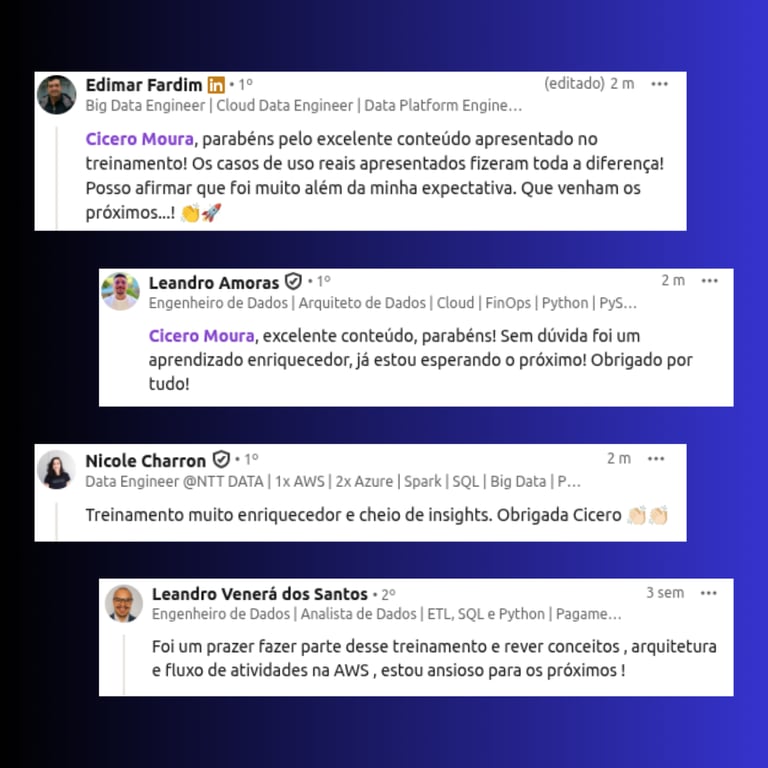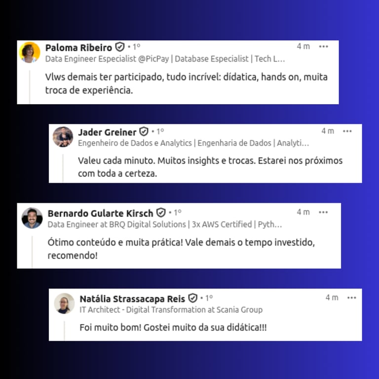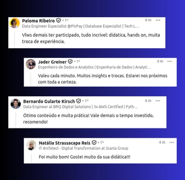 Somos especialistas em cursos online práticos focados em Engenharia de Dados, Arquitetura de Dados e Inteligência Artificial Generativa, oferecendo treinamentos ao vivo e gravados para capacitar Profissionais na área de Dados com AWS e Ferramentas Open-Source.
