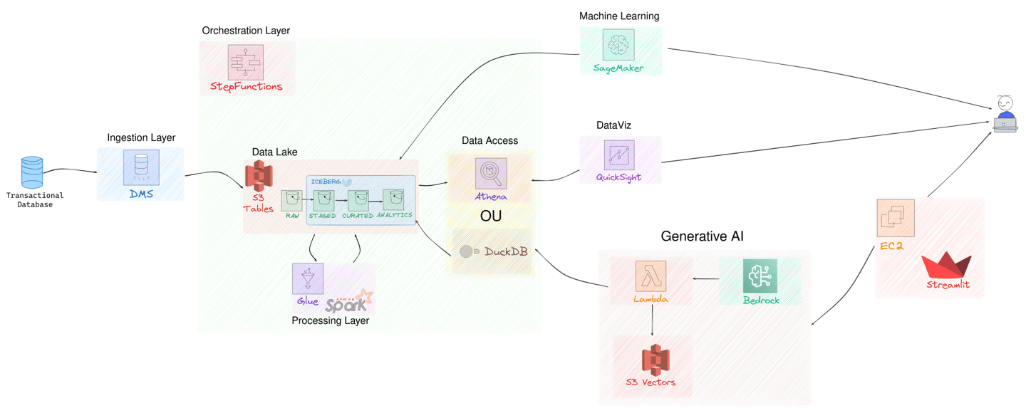 Neste workshop, você vai construir na prática uma solução completa na AWS: do pipeline de dados ao deploy de uma aplicação que transforma linguagem natural em SQL.